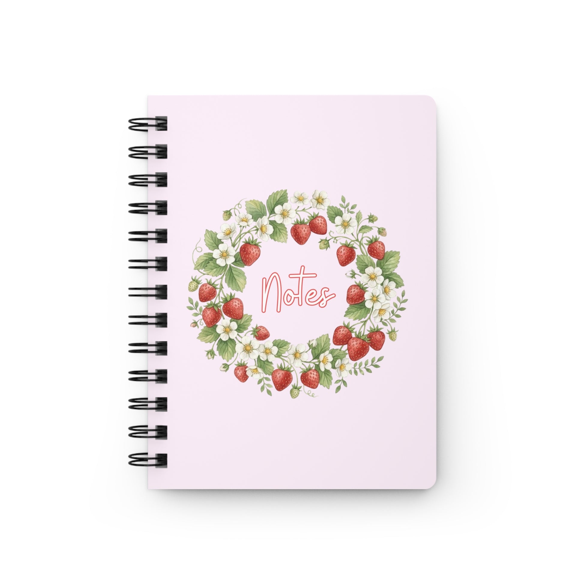 Soft-pastel charm meets everyday usefulness. This spiral-bound journal opens to 150 lined pages that invite morning lists, recipe ideas, garden notes, or sketching plans. A delicate wreath of strawberries and blossoms frames a handwritten “Notes” on the glossy front cover, while a small strawberry accent graces the back — a subtle, cheerful detail that keeps the design light and personal. The sturdy metal spiral lets you flip pages flat or remove them cleanly when you want to share a page or tuck a note into a planner. Bright, true-to-design printing and a glossy laminated cover protect your journal and make it feel polished in hand. Carry it to the cafe, the farmers market, or your work desk — it’s the kind of notebook that quietly makes ordinary days feel sweeter.
